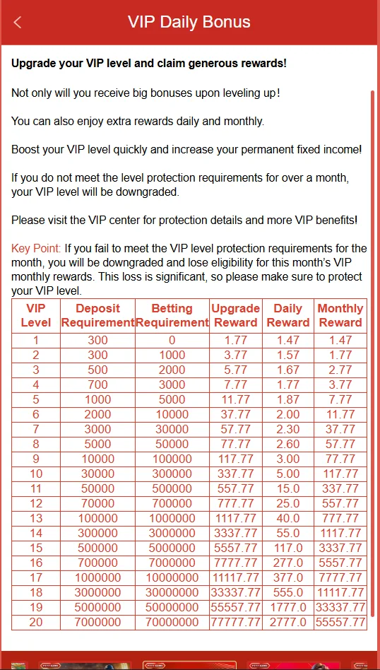 This VIP system gives players a clear path to earn more as they grow. Each level increases rewards, which makes every step feel valuable. Daily rewards give a steady income, while monthly rewards bring bigger gains. In addition, upgrade bonuses act like special gifts when you reach a new level. Because of this, users feel excited and stay engaged for a longer time.