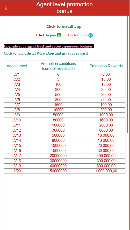 | Agent Level | Promotion Conditions (Cumulative Results) | Promotion Rewards |